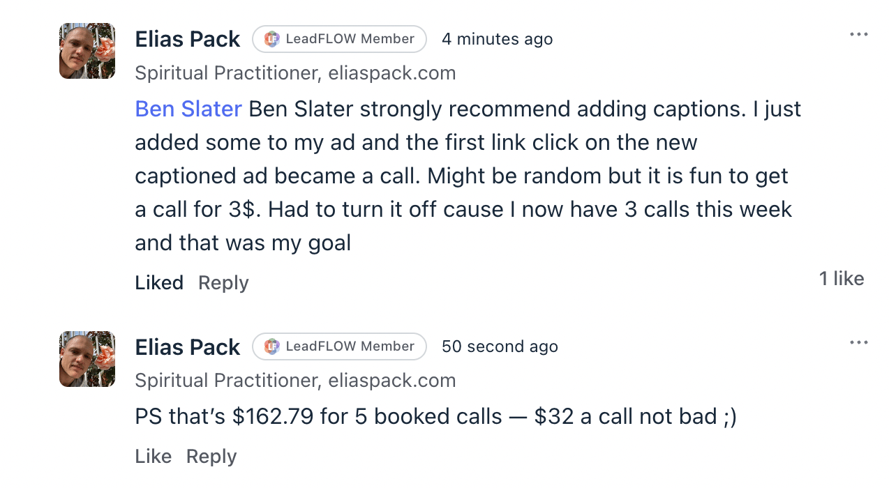 We’re also connected together in a Circle.so group where we’re giving each other feedback on our landing pages, sales process, content and ads.