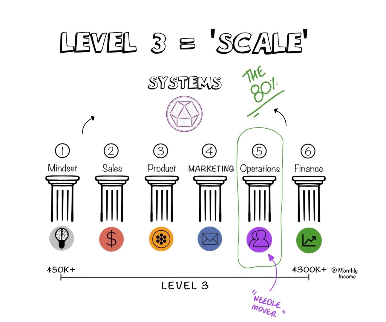 At all moments in your business the pillars exist. Mindset, Sales, Product, Marketing, Operations and Finance - take any one of these out and the business ceases to function.